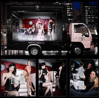 A bordo di un furgoncino, con una delle pareti laterali trasparenti per lasciar vedere il suo interno, tre avvenenti modelle vestite – o per meglio dire svestite – dell’intimo Agent Provocateur, si sono prestate ad un particolare gioco simil-erotico.