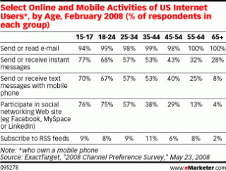 A questo rapporto si affiancano altre ricerche. La ExactTarget ha diviso gli utenti dai 35 ai 65 anni in 10 differenti categorie. Gli utenti dai 35 ai 44 anni usano in modo costante i social network, ma più l’età avanza più l’uso dei social network diminuisce. Per gli utenti tra i 55 e i 64 anni quelli che usano i social network sono solo il 13%, fino a diminuire al 4% per gli utenti dai 65 anni in avanti. In confronto a questi dati, però, più dei ¾ degli utenti internet di età compresa tra i 15 e i 24 anni usano assiduamente i social network.