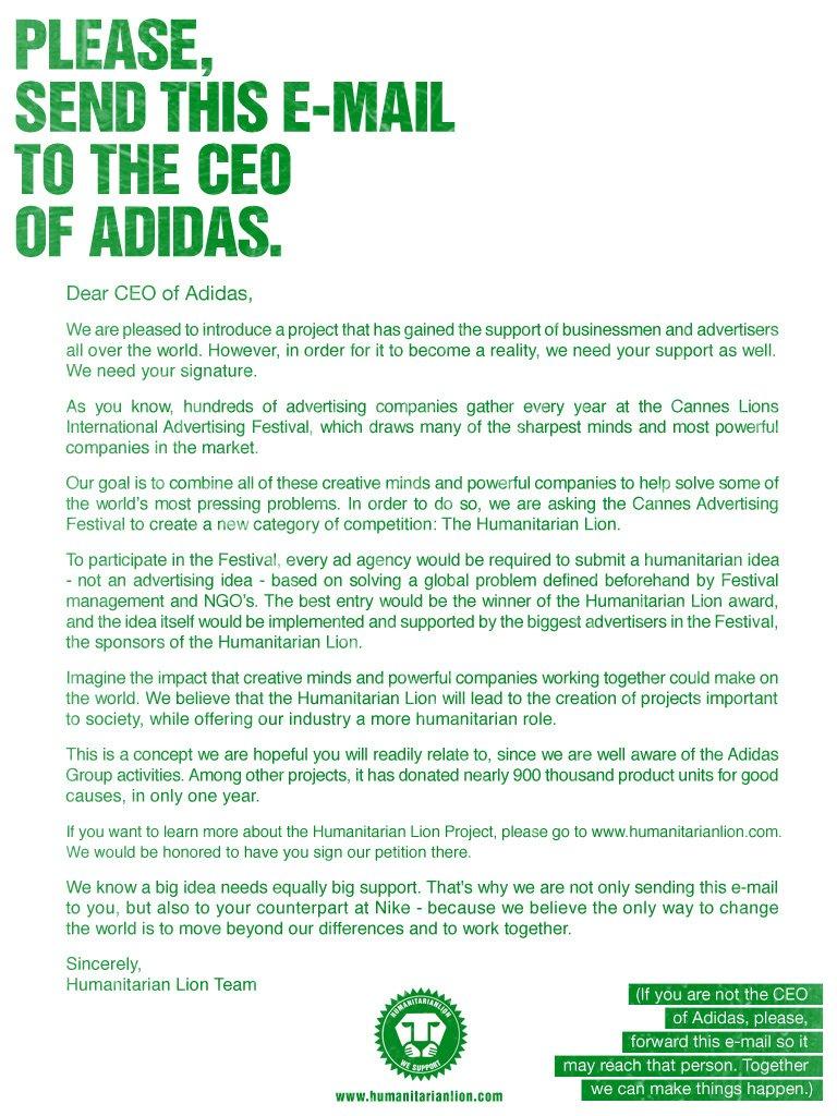 /in /da KemestrySenza dubbio si tratta di un’idea originale. Questa lettera dovrebbe, secondo il team degli Humanitarian Lions, arrivare prima o poi nelle mani del CEO di Adidas. Lettere simili sono state preparate per i CEO di Nike, Apple, Microsoft e altre importanti aziende. Un’idea semplice, basata un po’ sul concetto di “Sei gradi di separazione” che tanto va di moda di questi tempi.