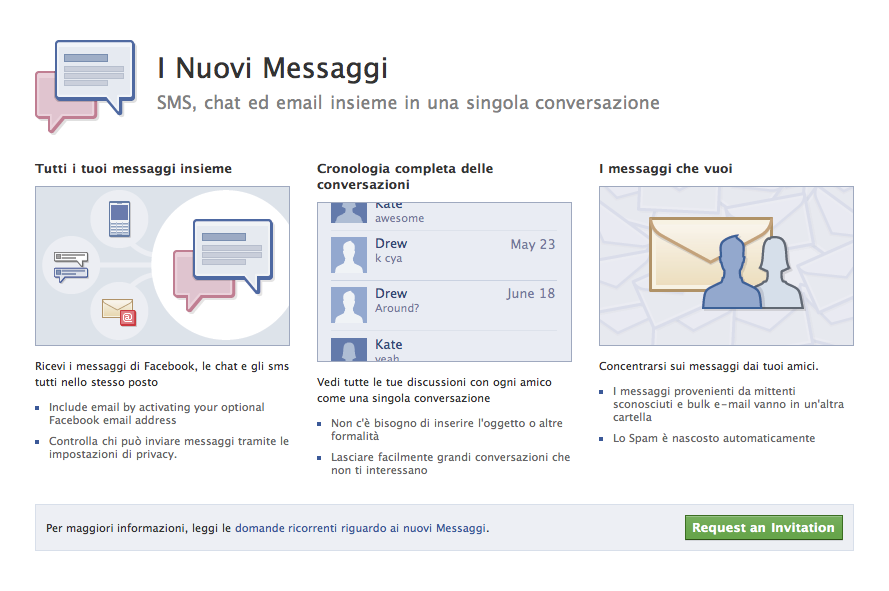 Facebook è andato oltre il concetto di email. La Gigabox Killer, come la chiama Zuckerberg, è alla base di una Next Generation Messaging. I ragazzi del liceo, la prossima generazione, infatti non usano le mail perché risultano troppo formali. Preferiscono le chat e gli sms. L'evoluzione dei Messaggi parte proprio da loro.