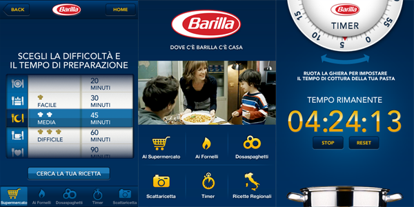 Così come nel mercato reale anche nel mondo App Barilla è leader. iPasta di Barilla ha già varie versioni. Nell'ultima versione offre il prontuario della cottura, il cerchietto dosaspaghetti, gli immancabili consigli per gli acquisti delle varie tipologie di pasta e anche la possibilità di suggerire una ricetta per occasioni o per regioni.