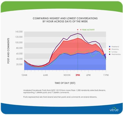 Il brand stream è avvenuto tra agosto 2007 e ottobre 2010 e sono state tenute in considerazione sia le variabili temporali (ore, giorni) che quelle interpersonali (commenti) senza tener conto delle variabili di engagement (ossia i “like”). La social media company Vitrue ha dunque stilato un libro bianco sull’argomento dal titolo “Managing Your Facebook Community: Findings on Conversation Volume by day of week, hour and minute”, analizzando un totale di 1,64 milioni di post e 7,56 commenti.