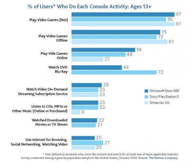 I risultati di queste statistiche – fa notare Nielsen – dipendono molto dalla strategia con cui le console sono state posizionate sul mercato. Se l’Xbox 360 ha puntato molto sul servizio Xbox Live (gioco online, acquisto contenuti e – in ultima istanza – social networking), PS3 ha scelto di investire sul lettore Blue-Ray per creare un centro multimediale domestico (da cui è dipeso un prezzo di lancio ben più alto della concorrenza – qui il riferimento a Kutaraji di cui sopra).