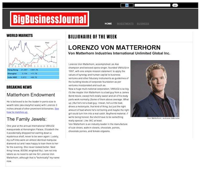 Barney Stinson, per chi non avesse familiarità con il personaggio, è un accanito playboy che ha inventato le mosse più incredibili per sedurre una donna. Una delle più celebri è sicuramente quella in cui si finge il ricco miliardario Lorenzo von Matternhorn. La fan page dedicata raccoglie oltre 20.000 fan che possono consultare anche la Lorenzopedia e le diverse pagine collegate come questa: