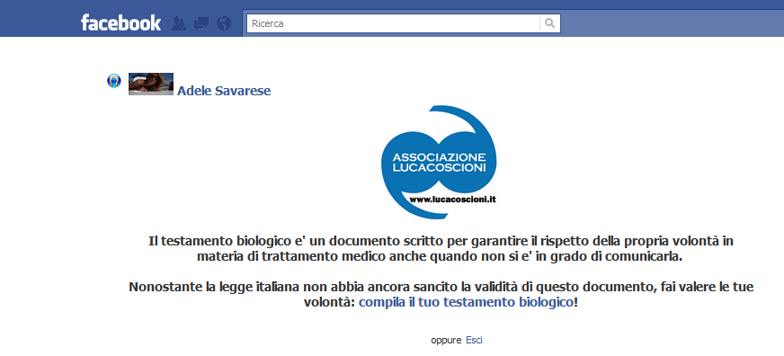 Alla fine della schermata, l’utente è invitato a visitare il sito dell’associazione Luca Coscioni per firmare e depositare il proprio testamento biologico in forma cartacea.