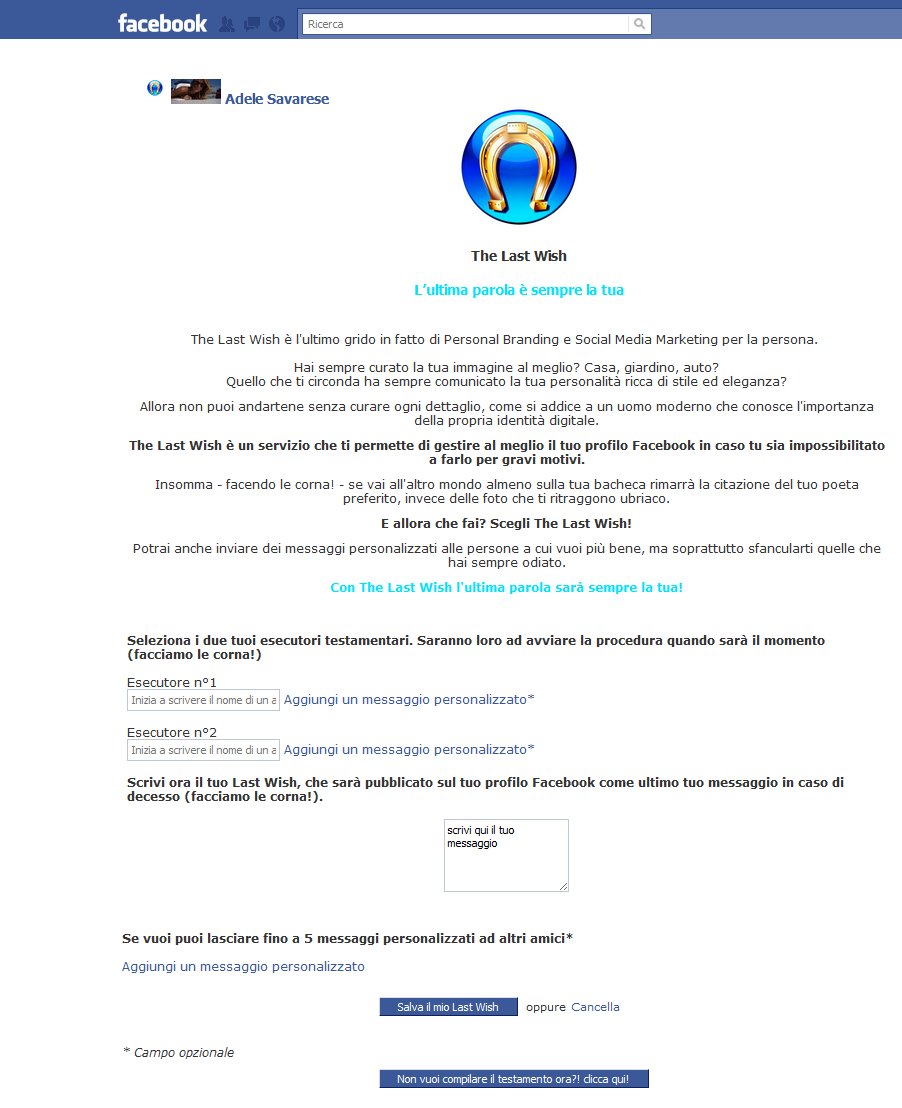 Un po' di tempo fa nell'articolo La morte al tempo di Facebook vi avevo spiegato cosa può succedere al vostro profilo dopo la morte. E' per questo che sono lieta di presentarvi un'applicazione di Facebook, The Last Wish (l'ultimo desiderio), con la quale il controllo passa direttamente nelle vostre mani.