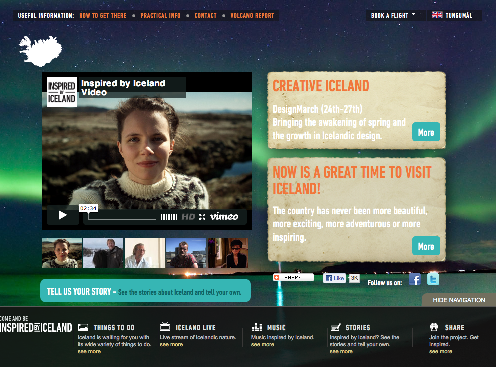 Veniamo poi ad un altro elemento trainante di questa campagna, il video Inspired by Iceland e il canale vimeo. Uno spot fresco e giovane, in sé mostra tutte le facce di uno splendido paese, sulle note di "Jungle Drum", canzone di Emiliana Torrini (artista islandese con origini italiane)
