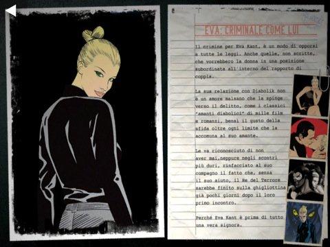 Tantissimi i materiali presenti nella prima release dell’applicazione: le schede di presentazione dei personaggi, da Diabolik a Eva Kant, da Ginko a Gustavo e Altea; sezioni dedicate alla Jaguar di Diabolik, alle sue armi e ai trucchi utilizzati per i furti; informazioni sui principali sceneggiatori e i disegnatori della serie; una mappa navigabile della città di Clerville, lo scenario delle avventure del re del crimine, con dieci punti di interesse attivi. E inoltre video-interviste e retroscena tratti dall’archivio delle creatrici del personaggio di Diabolik, le sorelle Angela e Luciana Giussani.