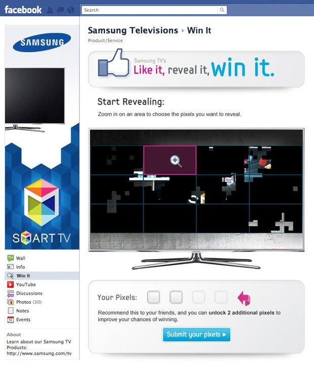 Samsung regala un prodotto alla settimana sulla pagina ufficiale di facebook, incentivando gli utenti a partecipare e invitare gli amici a questo concorso, infatti più amici si riesce ad invitare, maggiore sarà il numero di pixel da poter sbloccare. La campagna è stata realizzata con l’intento di fidelizzare i clienti su facebook, attualmente i risultati sono più che soddisfacenti con l’incremento di 12.000 fan in 10 giorni.