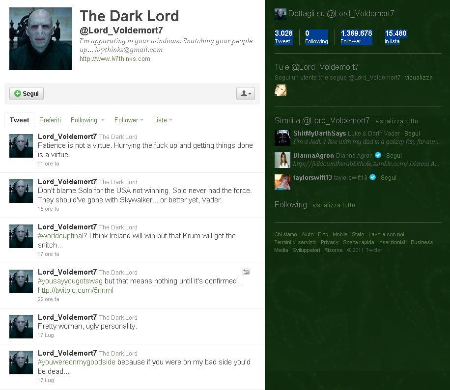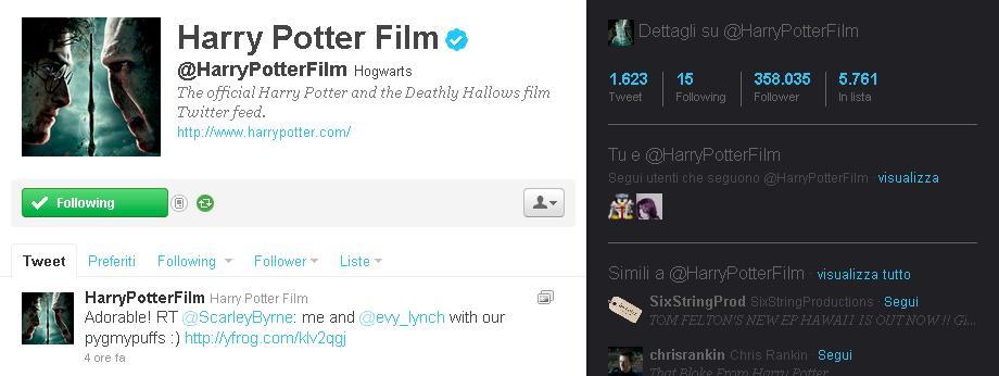Il profilo @HarryPotterFilm è l'account ufficiale su Twitter. Non conta il numero di fan di Facebook, anche se 351 mila follower non sono un brutto risultato Una piccola soddisfazione, almeno in questo campo, Lord Voldemort se la può togliere: il fake a lui intitolato conta ben 1.369.678 follower.