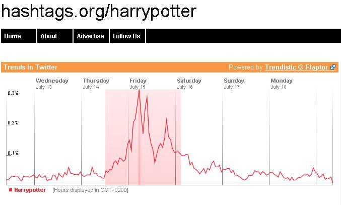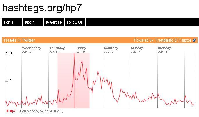 Altro elemento interessante da analizzare sono gli hashtag: in Italia e nel mondo durante il week end sono stata una presenza costante fra i trending topic #hp7, #pintus, #harrypotter, #voldemort.