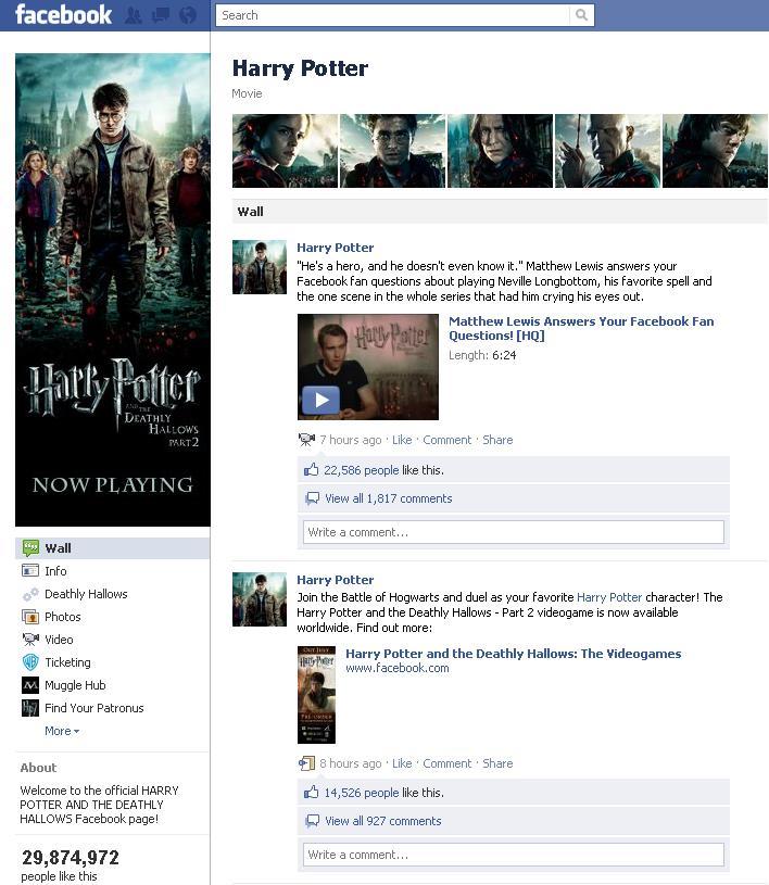 La pagina fan è stato uno spazio molto importante per promuovere il film, utilizzato per raccontare il making of , promuovere merchandising ufficiale e recensioni, condividere interviste ai protagonisti, e come vedremo più avanti nel post anche per condividere eventi live. Oltre a una "referente" internazionale, la Warner Bros ha anche aperto una pagina fan per ogni paese: per il Regno Unito (Harry Potter UK, poco più di 1 milione e 200 mila fan), uno in spagnolo per l’America Latina (Harry Potter America Latina, circa 194 mila fan) e anche per l'Italia (Harry Potter IT, poco più di 16 mila fan) .