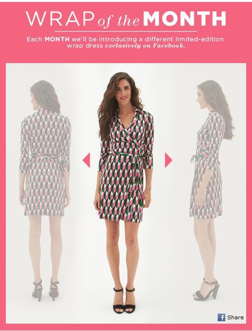 L'iniziativa si chiama Wrap of the Month e consiste nel mettere in vendita un abito diverso ogni mese, acquistabile solo su Facebook. Ovviamente in limited edition. Dopo un paio di operazioni - scelta della taglia e del numero di pezzi, si viene reindirizzati alla sezione e-commerce sul sito ufficiale della designer, dove è possibile proseguire lo shopping o confermare l'acquisto.
