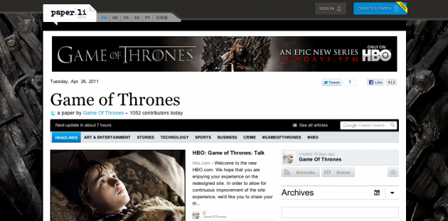 E mentre nuove applicazioni si diffondono le tradizionali campagne di marketing social sul web si complessificano ulteriormente, coinvolgendo sempre più piattaforme, dimensioni e partner. E’ il caso di Paper.li, la startup di content curation che si è unita a HBO per promuovere la serie Game of Thrones creando una pagina branded con contenuti editati e curati intorno all’universo della serie.