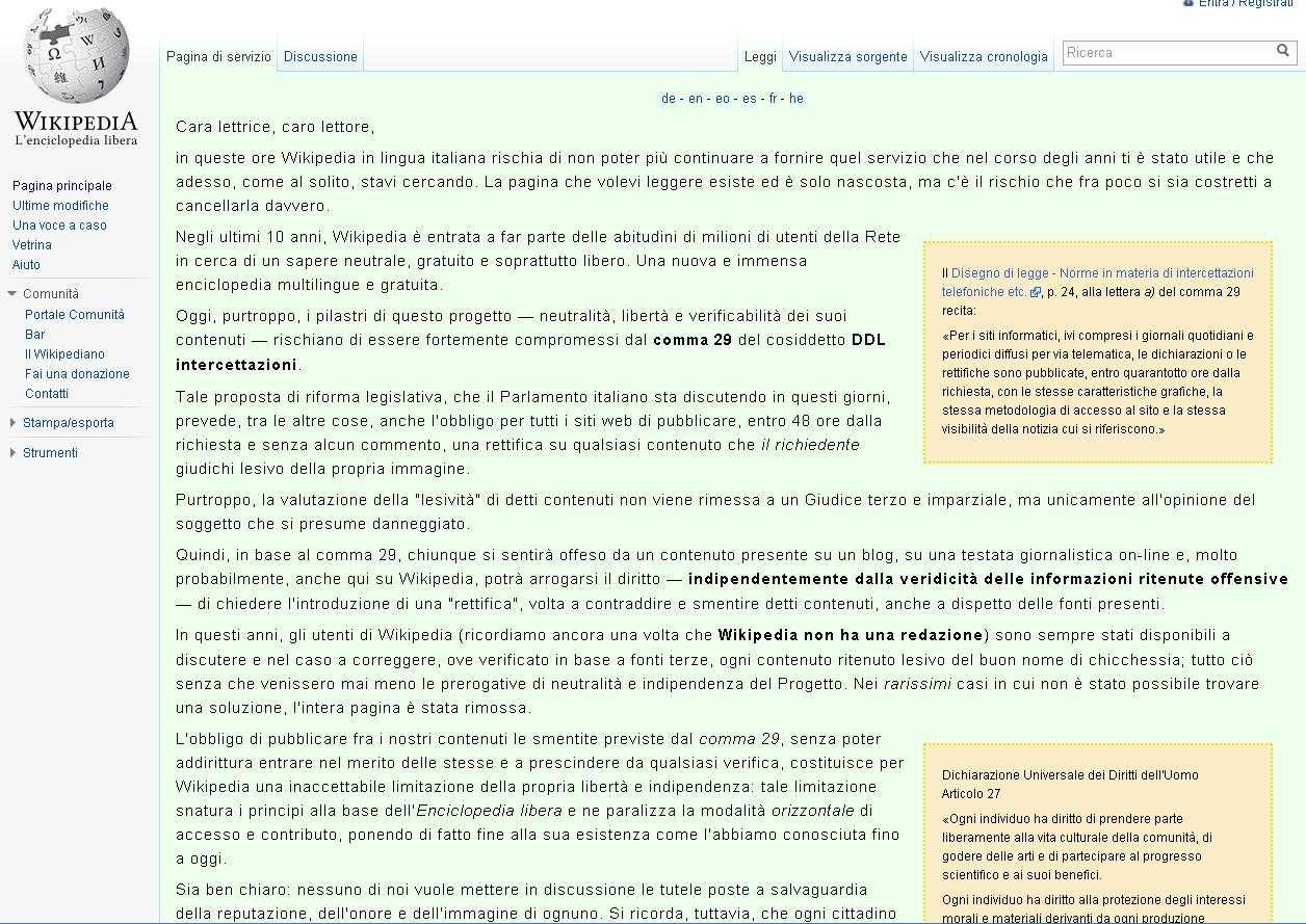 Ieri sera, l'enciclopedia on line più famosa del mondo ha pubblicato un comunicato che annuncia la preventiva chiusura dell'edizione italiana, proprio per protestare contro il ddl.