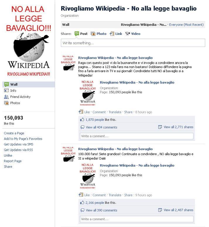 Su Facebook la pagina Rivogliamo Wikipedia - No alla legge bavaglio (la prima ad essere aperta dalla pubblicazione del comunicato) conta già 150.000 fan, in rapida crescita. Non si contano invece il numero di condivisioni sui profili personali del comunicato apparso in home page.