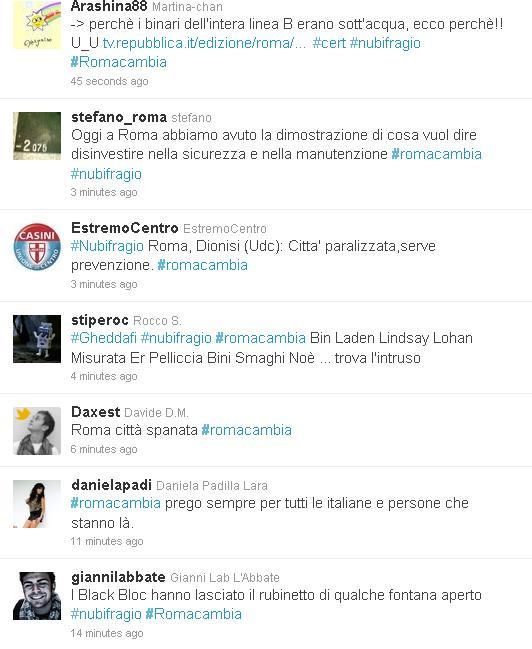 Inutile dire che, insieme a #nubifragio, l'hashtag #romacambia è stato il più utilizzato per tweettare le proprie testimonianze dalla città allagata, riproponendo anche qui quel fenomeno che abbiamo più volte analizzato e che è ormai diventato tipico quando si verificano calamità naturali (vedi anche Terremoto a Torino, la notizia corre sui social [BREAKING NEWS]), dove sono gli stessi utenti a realizzare una cronaca dettagliata in diretta del susseguirsi dei fatti.