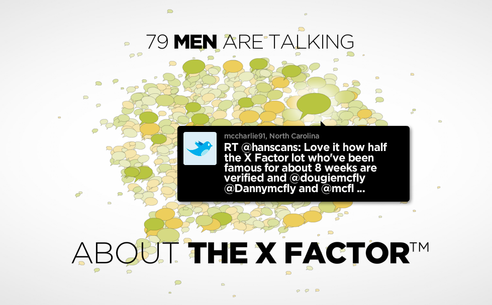 La prima è una piacevole rappresentazione grafica dei commenti su Twitter. Come possiamo vedere vengono selezionati i tweet, in base alle "categorie", agli hashtag o ai contenuti, e presentati in veste grafica. Troviamo per esempio: “ 69 people like X-Factor” oppure “79 ragazzi stanno parlando di X-Factor” o ancora “2 persone stanno parlando di Paula".