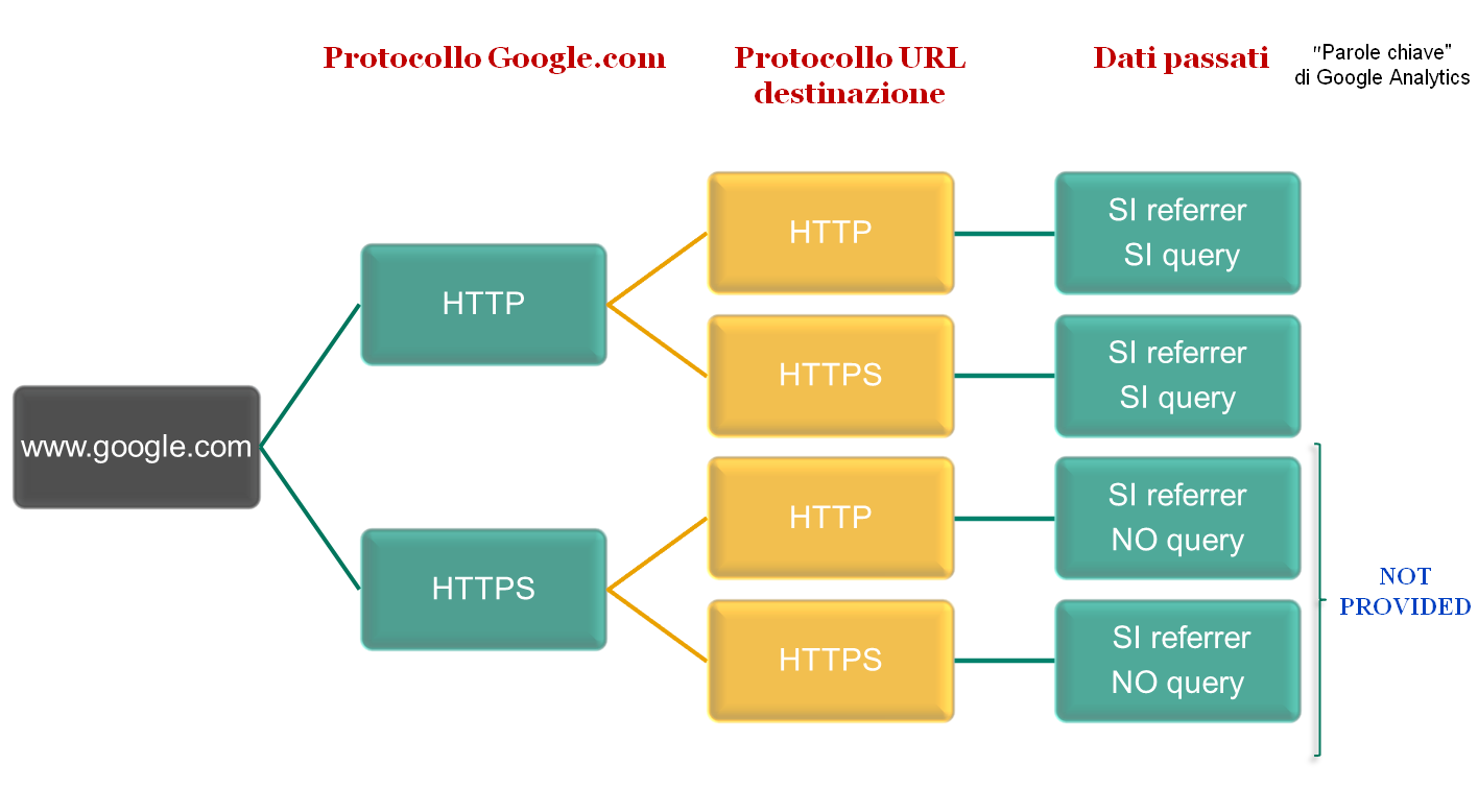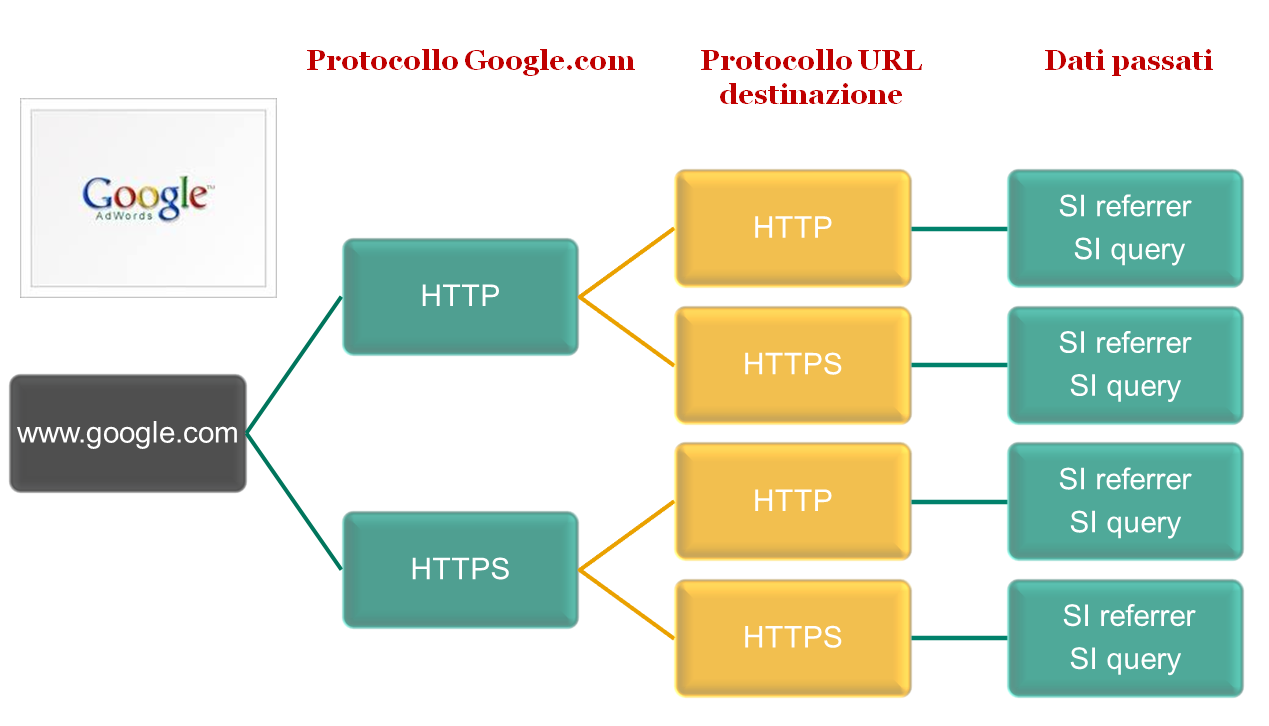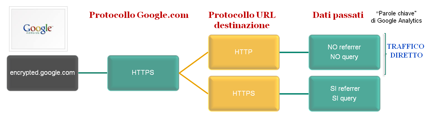 Nota: Dobbiamo precisare come il comportamento di un client su encrypted.google.com (sia per i risultati organici che a pagamento) relativamente al non-invio di Referer da HTTPS ad HTTP è quello standard, previsto dalla specifica del protocollo HTTP: