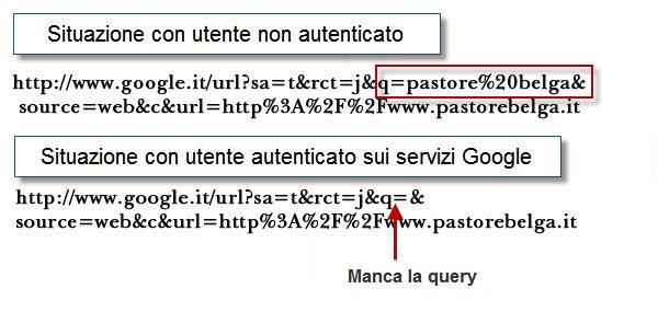 Nota: In parole povere: supponiamo che un utente sia autenticato con Gmail ed effettui una ricerca in Google (la modifica annunciata sarà completamente attiva nei prossimi mesi), ad esempio "pastore belga". Compariranno, ovviamente, un elenco di pagine web inerenti alla parola chiave ricercata. Cliccando su uno dei risultati presenti nella SERP, al sito di destinazione (in base alle casistiche che vedremo nei test), non verrà passata la query di ricerca. Questo vorrà dire che conosceremo l'url di "partenza" ma non sapremo per quale keyword l'utente ci ha cercato. Un problema non di poco conto per i sistemi di analisi dei dati web.