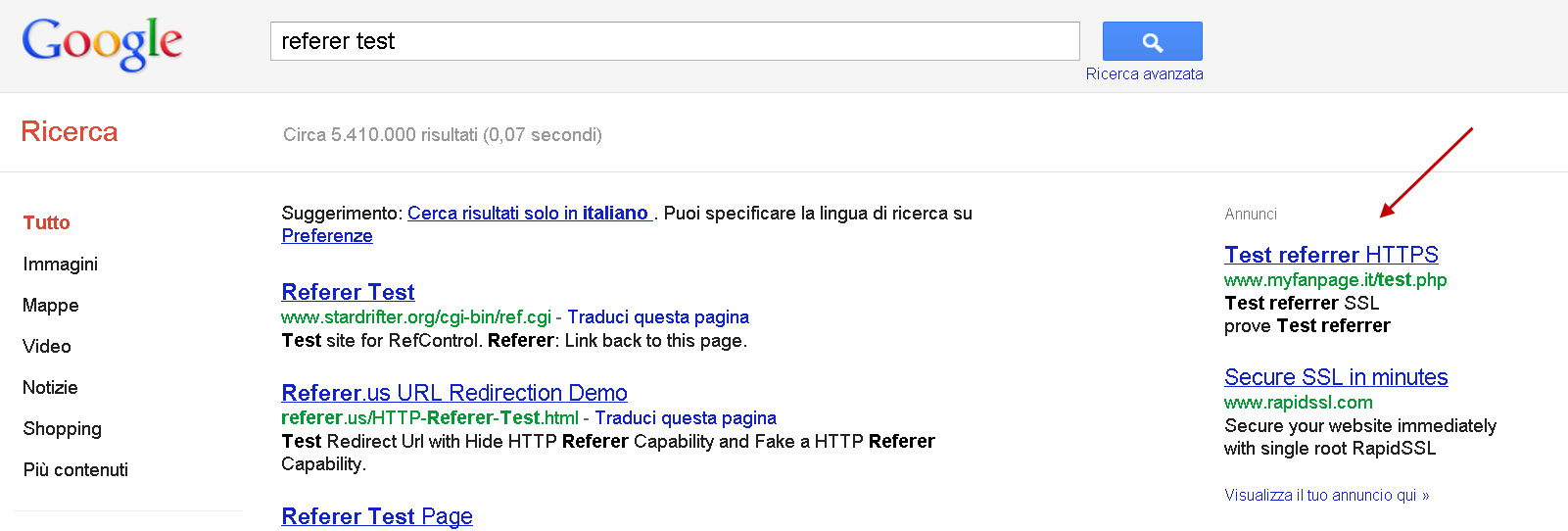 Per i risultati a pagamento,provenienti da Google AdWords la situazione è completamente diversa; per testare il comportamento abbiamo prodotto due annunci ADWords in grado di fornirci il referer: http://myfanpage.it/test.php e https://myfanpage.it/test.php