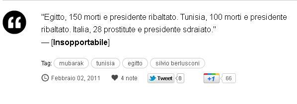 Imperversa il cosiddetto Rubygate e al centro della scena ci sono le abitudini sessuali dell'ex presidente Berlusconi. Un tema che tocca anche febbraio, ma che si mescola alle notizie che giungono dal nord Africa: in occidente si intravedono i primi fuochi della primavera araba.