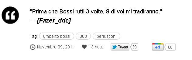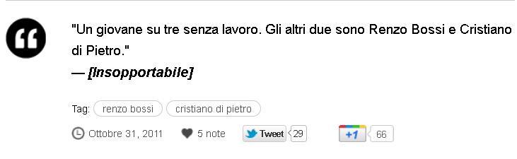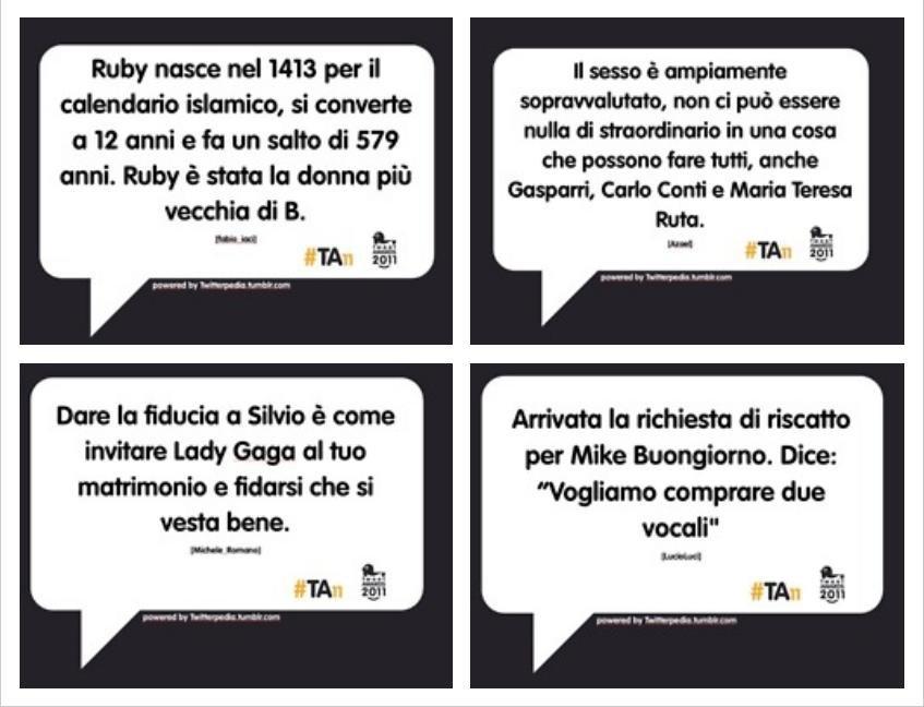 Il 2011 intanto corre: a settembre comincia a montare la protesta a New York del movimento Occupy Wall Street, e il governo scricchiola sotto i colpi delle continue manovre finanziarie scritte e riscritte dal ministro Tremonti. Ma è anche il mese dei tweet awards, dove viene riproposta una summa dei migliori tweer letti nel 2010 - 2011. TweetPedia ne raccoglie diversi, noi ve ne proponiamo 4: