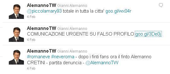 "Vi segnaliamo una gravissima sottrazione di identità verificatasi sul Social Network Twitter, ed avvenuta tramite una combinazione per niente casuale delle lettere del cognome del sindaco Gianni Alemanno.