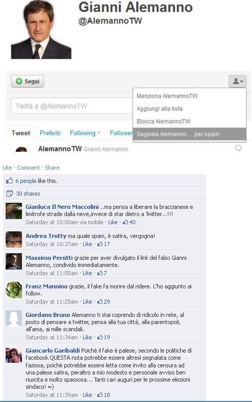 Partendo da queste conclusioni ci sono sembrate interessanti le polemiche che si sono scatenate intorno all'account "fantoccio" o fake di Gianni Alemanno, sindaco di Roma, replicato da qualche buontempone nel pieno della crisi - neve dei giorni scorsi.
