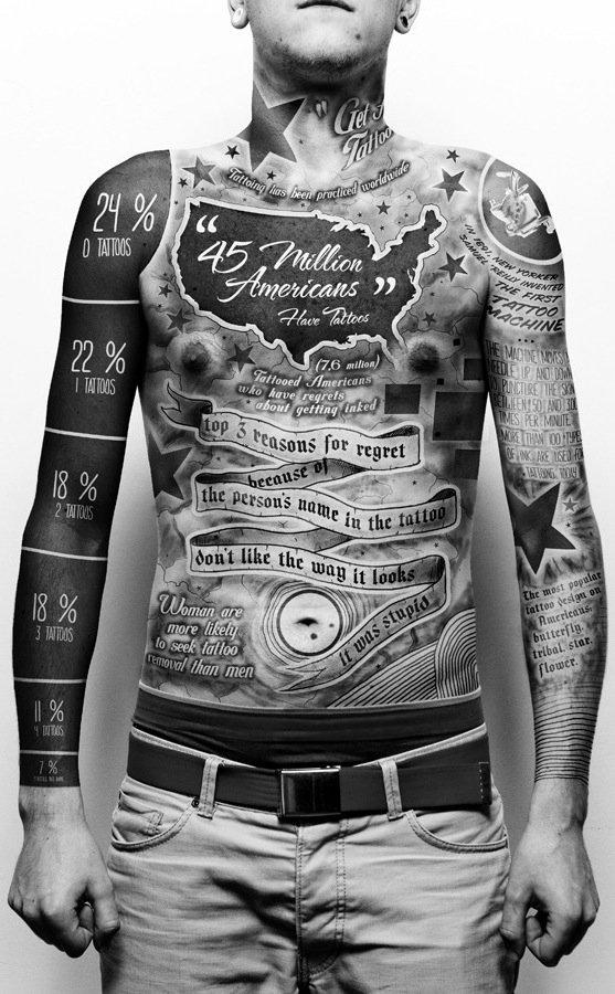 L’artista polacco Paul Marcinkowski ha creato un’infografica sui tatuaggi davvero incisiva: anzichè utilizzare un classico foglio bianco, ha usato il proprio corpo, trasformando le informazioni in un tatuaggio che gli ricopre la parte superiore del corpo: collo, braccia e busto.