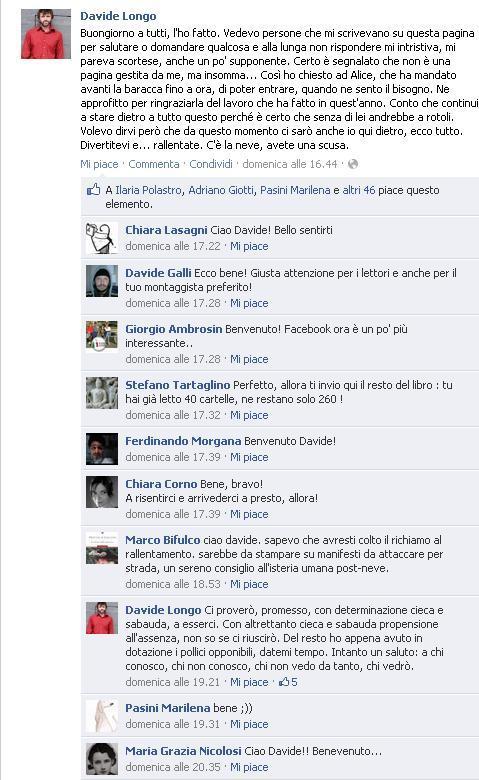 A questo proposito, citiamo l'esempio di Davide Longo, che è approdato su Facebook grazie a una sua ex allieva che, appassionata dei suoi romanzi e delle sue lezioni, ha aperto una pagina fan e l'ha promossa in piena autonomia. Questo post è molto in linea con il concetto proposto da Matt: