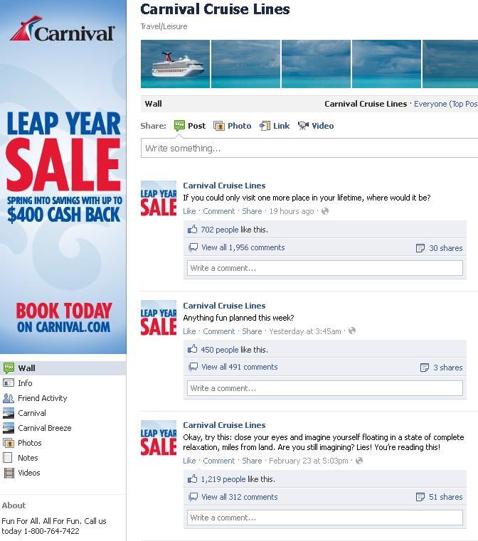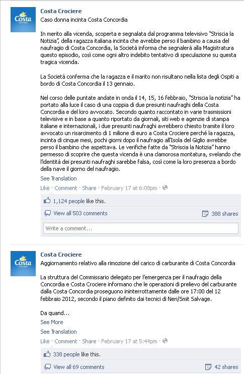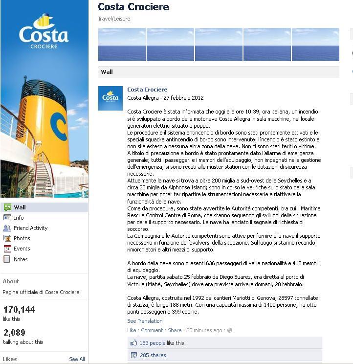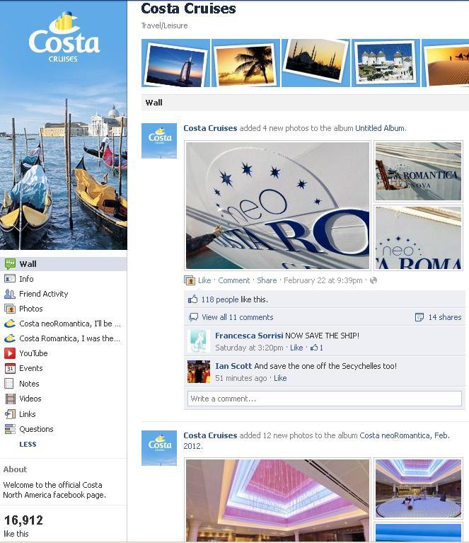 Colpisce questa asimetria proprio per la cura con cui anche un episodio come quello capitato alla Costa Allegra sia seguito dalla redazione che cura la pagina fan di Costa Crociere Italia, cosa che neanche la stessa casa madre Carnival riesce a fare.
