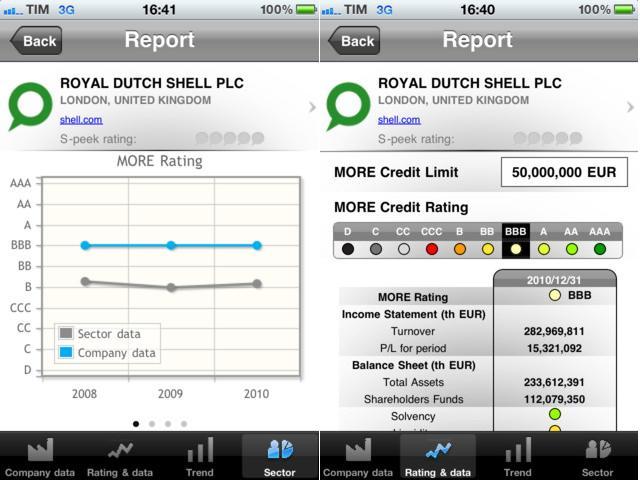 L'applicazione, scaricabile gratuitamente su App Store e Android Market, da la possibilità sfruttando un modello “Freemium” di consultare le informazioni economiche e il rating reso da modeFinance relativamente ad una delle milioni di aziende attualmente racchiuse nel prodotto S-peek.