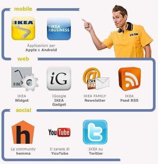 L'azienda ha attivato una strategia multi-piattaforma che sfrutta le specificità di ciascun social media, in particolare Facebook, Twitter e Youtube. Ikea si difende bene anche sul versante Mobile in cui fornisce applicazioni e cataloghi consultabili da tablet e smartphone.
