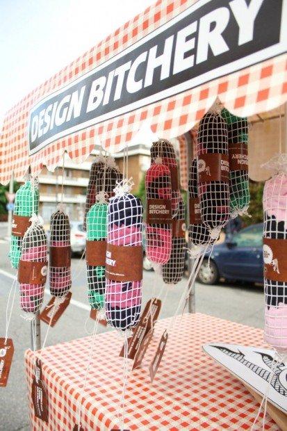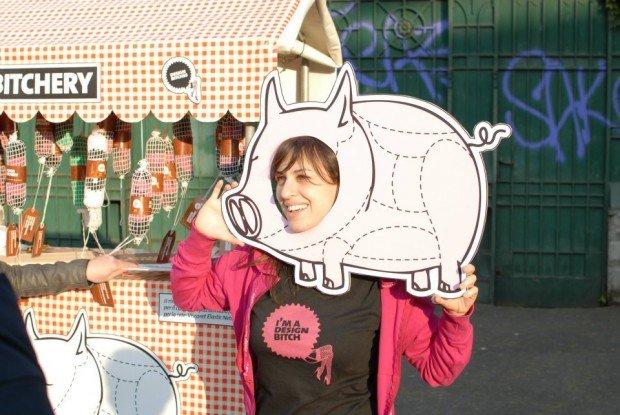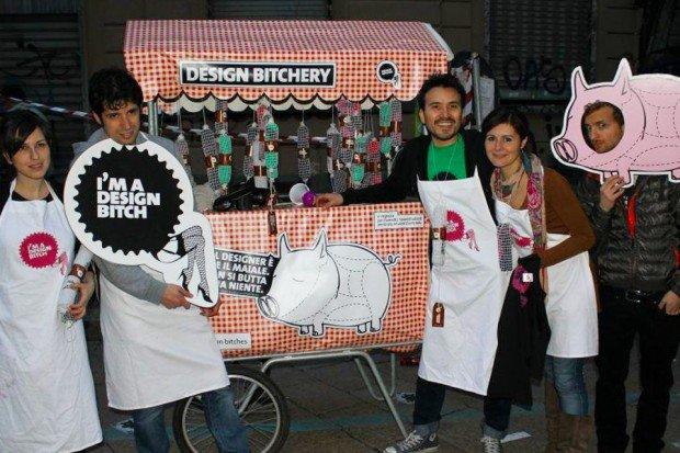 I creatori di Design Bitches, in tenuta da salumieri hanno percorso le vie di Milano con un carro allegorico colmo di insaccati, su cui campeggia l’insegna Designer Bitchery, invitando i passanti a scattare una foto ed a condividerne la sfortunata sorte, indossando una sagoma di un maialino in cambio di una T-shirt a forma di salame con tanto di targhetta, che recita: “I nostri designers provengono da allevamenti a terra nei quali possono muoversi liberamente dando sfogo alle loro attitudini individuali. Sin dalla loro nascita vengono alimentati con una dieta arricchita di costosi workshop, false promesse e aspettative con un programma affezionato dai migliori allevatori del design. Una volta giunti a piena maturazione, superati i nostri rigidi controlli di qualità, vengono messi in fila e macellati per diventare gustosi insaccati. Il tutto per offrirvi un prodotto di qualità, genuino e innocente, pronto per ogni uso”.