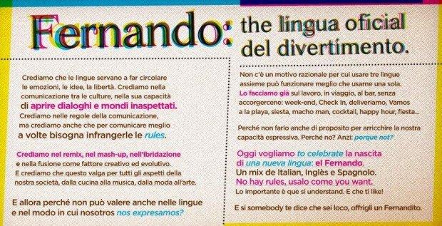 Un vero e proprio remix culturale eseguito sulle note di un mash-up linguisto: il Fernando. Italiano, inglese e spagnolo si mescolano proprio come avviene nel cocktail Fernandito che accompagna gli eventi di aggregazione del movimento. Ebbene sì, come esprimere il movimento se non attraverso il linguaggio che riguarda tipicamente la musica?
