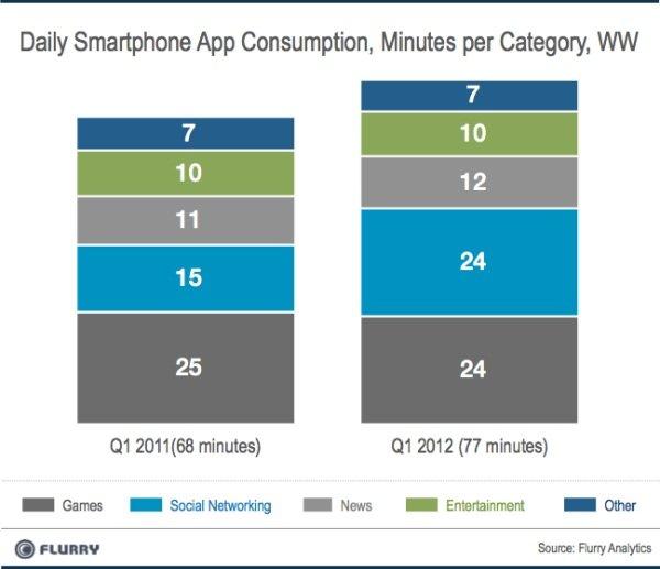 Non è un caso che a contendersi il primato dei consumi giornalieri su dispositivi mobili siano le app dei social network e le game app, con 24 minuti a testa su un totale di 77! (fonte: Flurry Analitycs, "Daily Smartphone App Consumption, Minutes per Category, WW").