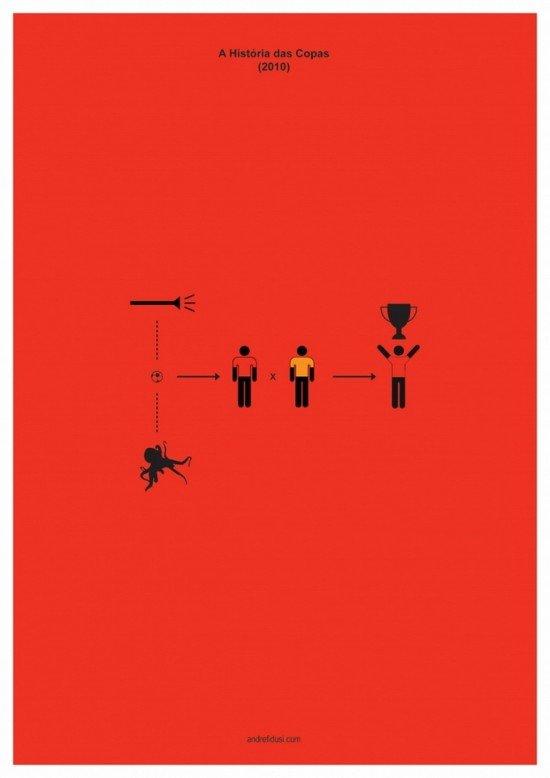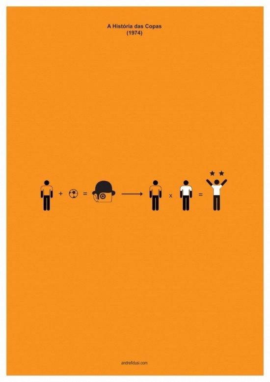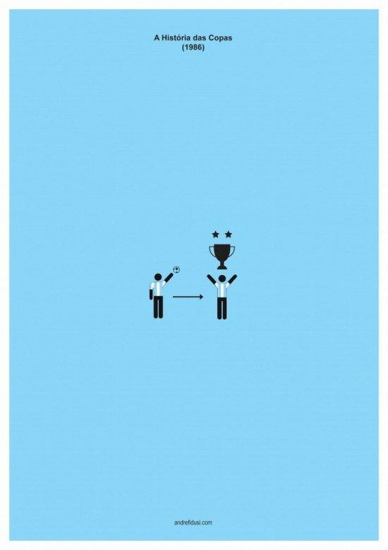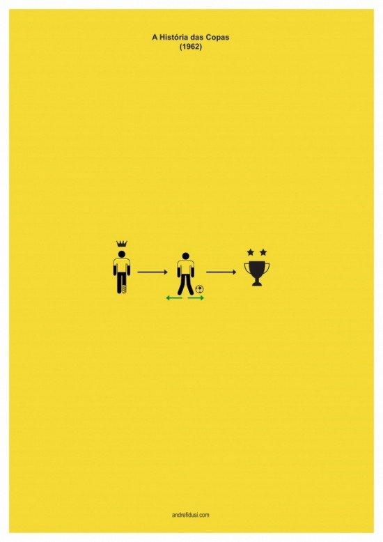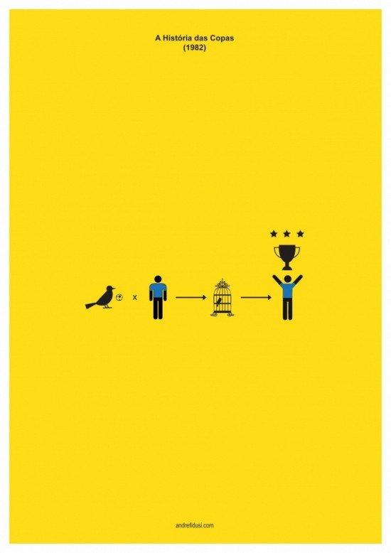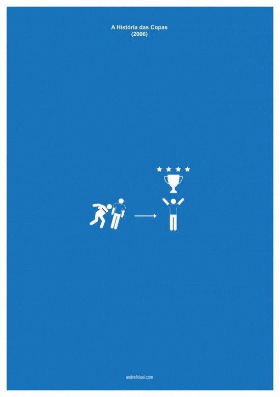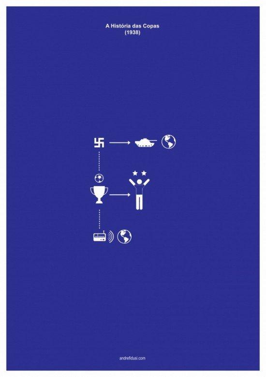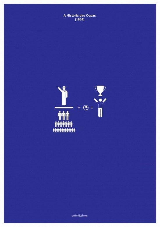 André Fidusi è noto per i suoi lavori grafici abbastanza particolari: traduce in disegni stilizzati fatti storici o d'attualità. Questa volta Fidusi, che è in realtà un giornalista trentenne brasiliano (e ve ne accorgerete dalle illustrazioni), dedica la sua creatività alle finali dei Mondiali di calcio. Ogni poster racconta una gara finale, in tutto 19 lavori, utilizzando omini e simboli grafici.