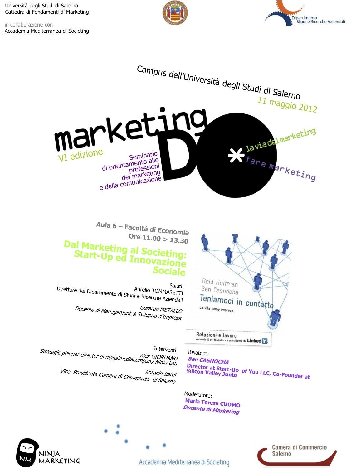 Nell’ambito della sesta edizione di Marketing Do, organizzato dal Dipartimento di Studi e Ricerche aziendali dell’Università di Salerno con l’Accademia Mediterranea di Societing ed il patrocinio della Camera di Commercio di Salerno, il guru della Silicon Valley incontrerà l’innovatore salernitano Alex Giordano, cofondatore di Ninja Marketing nonché direttore del Centro Studi Etnografia Digitale.