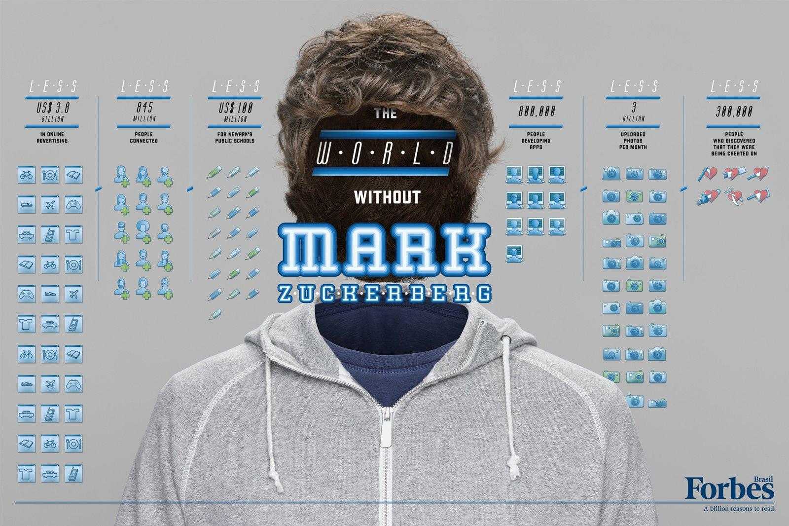 La seconda parte della campagna, invece, realizzata su stampa e chiamata “The World Without“, mostra come sarebbe stato il mondo se alcuni personaggi molto noti non fossero mai esistiti. L’esempio più attraente è ovviamente quello di Mark Zuckerberg. Senza il papà di Facebook oggi dovremmo fare a meno di 3 miliardi di foto caricate ogni mese, di 3,8 miliardi di dollari investiti in pubblicità online e…scoprite il resto! Che mondo sarebbe senza…