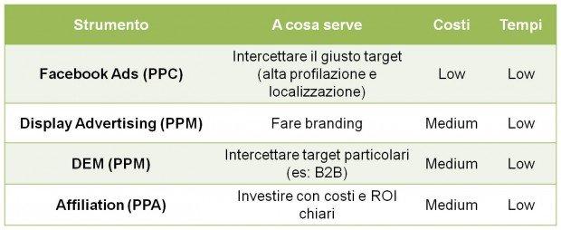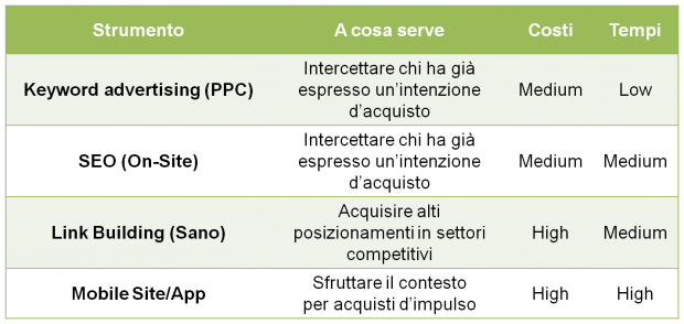 Ogni canale ha costi diversi e necessita di periodi di tempo differenti per ottenere dei risultati, per questo a seconda della fase nella quale ci troviamo, esiste una combinazione di strategie più adatta.