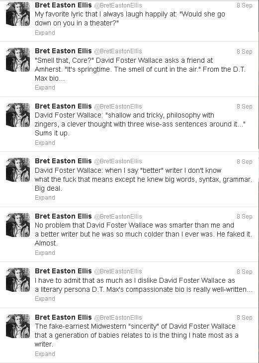 Lo scorso 6 settembre, Bret Easton Ellis pubblica alcuni tweet particolarmente pungenti nei confronti del defunto autore David Foster Wallace, morto suicida nel 2008.