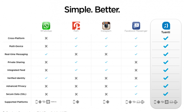 In realtà non è così, Tuenti è unico nel suo genere: la prima piattaforma di comunicazione sociale ad offrire in un’unica soluzione alti livelli di privacy e sicurezza, semplicità, mobilità ed identità reale, un servizio di messaggistica istantanea insieme all’engagement di un social network fruibile su molteplici dispositivi e piattaforme. L’immagine qui sotto ben mostra visivamente tale prospettiva: