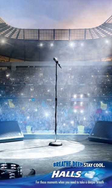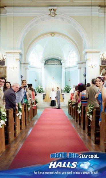 Il payoff recita: “Respira Profondamente. Sii cool. Per quei momenti in cui hai bisogno di fare un respiro profondo”. Una serie di annunci stampa molto simpatici dell’agenzia JWT di Londra ci ricordano quali sono i momenti migliori per prendere una caramella Halls e tranquillizzarsi. L’effetto positivo e rilassante che può dare la Halls vi garantirà la possibilità di attendere la vostra sposa all’altare, di fare colpo su una ragazza che vi piace e con cui non riuscite a parlare, vi potrà aiutare se state per salire su un palco e siete preoccupati.