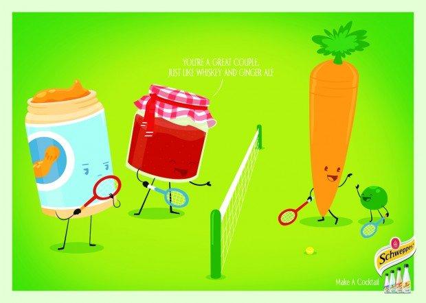 Una partita di tennis. Una carota, un cetriolo, da un lato. Due vasetti di marmellata e burro d’arachidi, dall’altro. Il payoff recita: Siete una bella coppia, proprio come Whiskey e Ginger Ale. Fatti un cocktail. L’agenzia ACW Grey di Tel Aviv ha dato vita a dei simpatici annunci stampa ricordando il legame tra la bibita analcolica Schweppes e lo sport. Il marchio di Coca Cola Company è stato già in passato sponsor ufficiale del torneo di Tennis Master di Madrid. L’analogia tra la voglia di giocare e la voglia di fare festa è molto sottile.