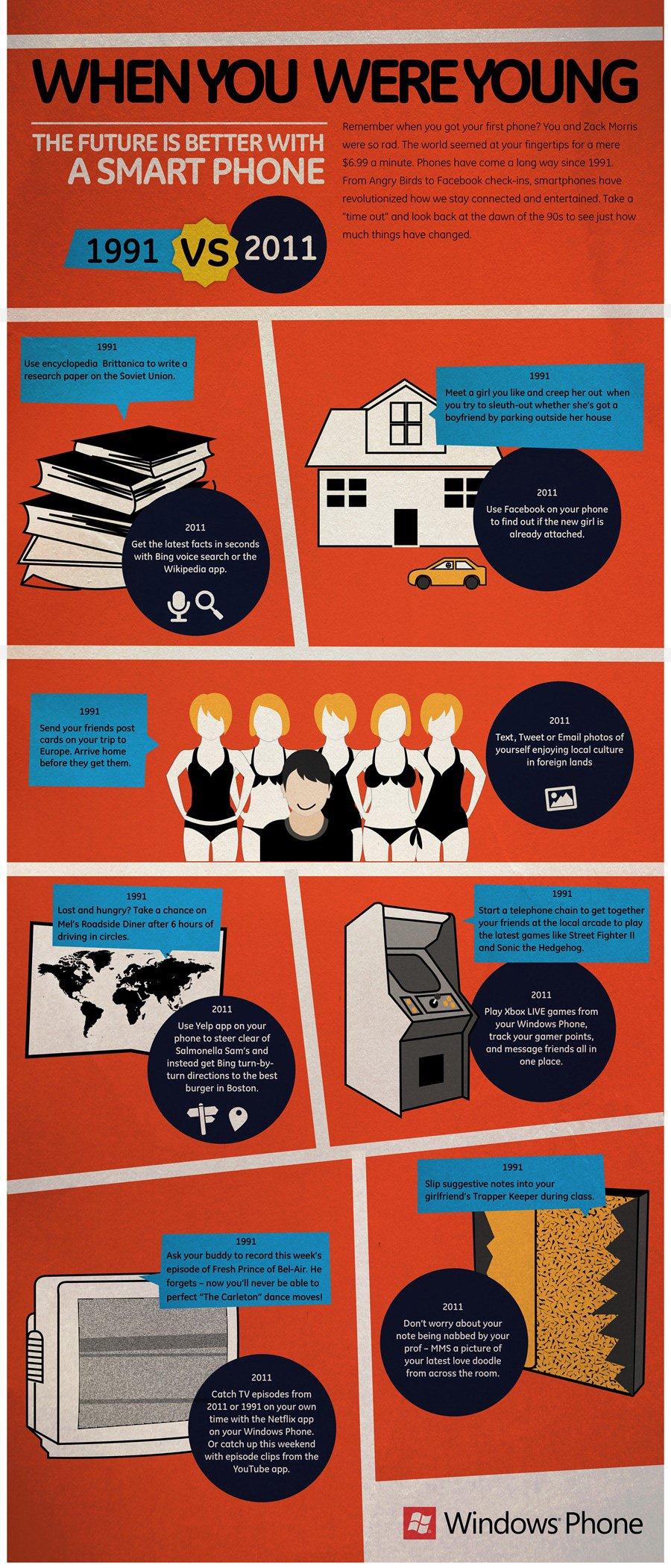 Windows ultimamente ha fatto leva sulla nostalgia della '90 generation. Sia nel video che nell'infografica che segue viene sottolineata la potenzialità degli strumenti mobile: il superamento di limiti che diamo ormai per scontati.