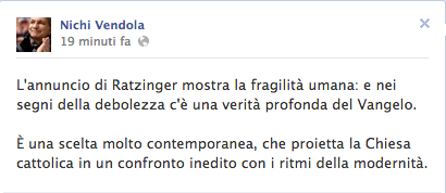 Anche i politici hanno voluto dire la loro usando i social network, questo ad esempio è il messaggio postato da Nichi Vendola sulla sua pagina fan di Facebook: