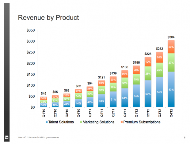 LinkedIn ha pubblicato nei giorni scorsi i risultati del quarto trimestre del 2012. I numeri sono più che positivi. Il social network per professionisti ha superato la soglia dei 200 milioni di iscritti e durante il 2012 ha raggiunto un fatturato di 972,3 milioni di dollari con un aumento dell’86% rispetto al 2011. Risultati floridi sotto tutti i punti di vista.