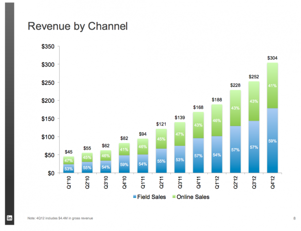 Questi numeri implicano che almeno un migliaio di questi siano impiegati nel marketing e nelle vendite. Infatti, la rete sociale dell’utenza business ha un incredibile armata di venditori che genera il 59% dei suoi profitti totali. Avete capito bene. Un business che nasce online, ma che dipende in gran parte dai ricavi che raggiunge la sua forza offline.