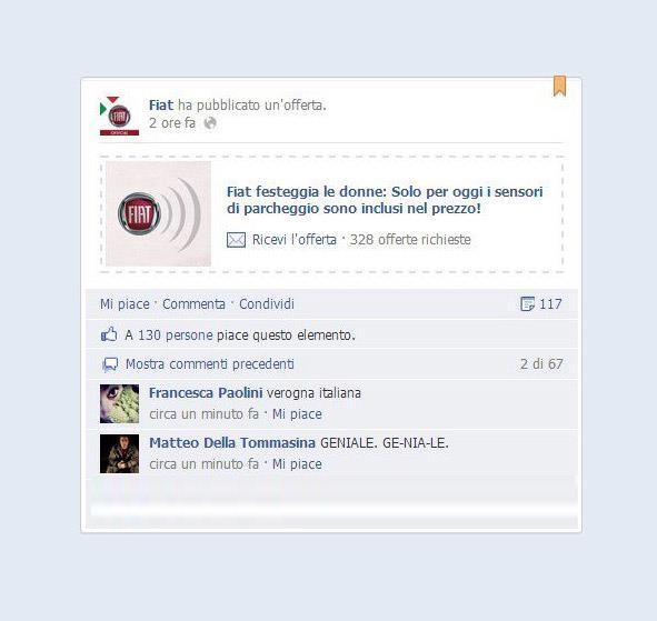 Evidentemente in Fiat qualche burlone ha pensato di voler esprimere solidarietà ai colleghi di Algida. Nasce quest’offerta che ha diviso con ironia il web. Qui il discorso è diverso rispetto ad Algida. Non stiamo parlando di un semplice contenuto postato sulla pagina fan. C’è un’offerta che è scaturita probabilmente dallo sforzo creativo di tutto il dipartimento di Marketing. Creare scalpore è il risultato che si aspettavano? Ci lascino dire che, al di là dei numeri, hanno compiuto un mezzo autogoal. Non siamo tanto sicuri che le clienti Fiat siano rimaste colpite da questa impareggiabile offerta. E i numerosi commenti ci danno ragione. In questo giorno il solito “stereotipuccio” potevano davvero risparmiarselo.